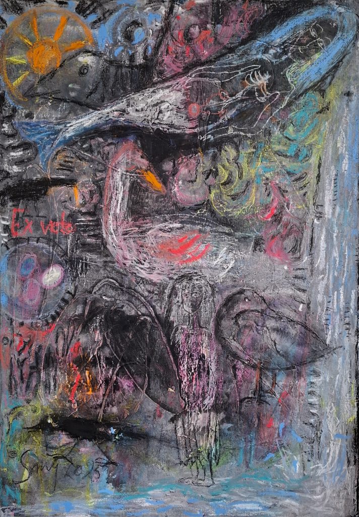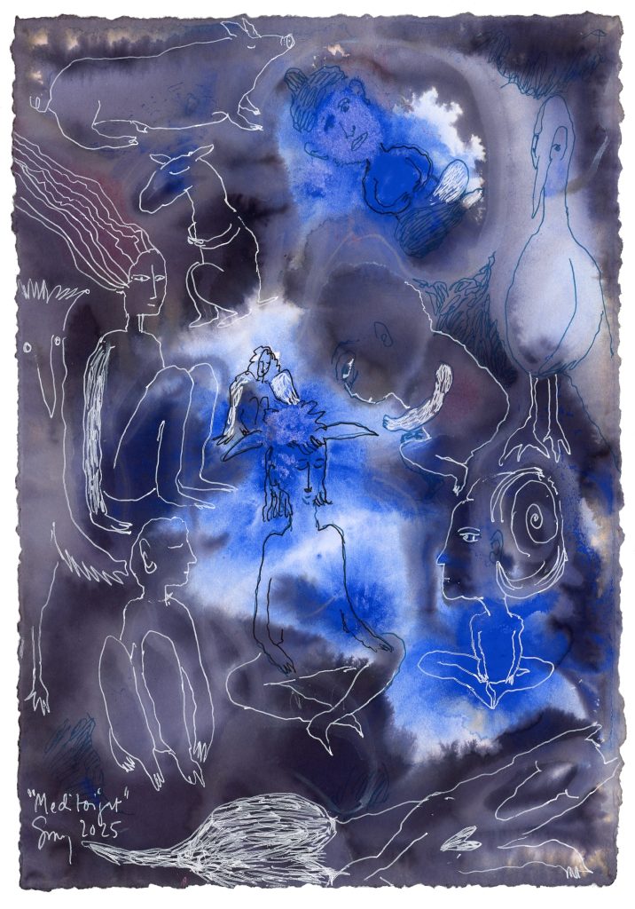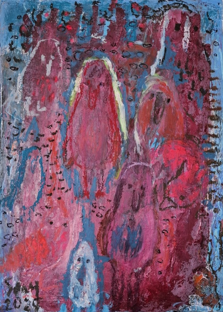 Ex-voto 2025. Sekatekniikka kankaalle, 116x80cm Kahlaajat 2025. Sekatekniikka kankaalle, 100x130cm Kaksoset 2025. Sekatekniikka kankaalle, 82x82cm Päivähattu 2025, sekatekniikka puulle 44x18cm Lintuperspektiivi 2025. Sekatekniikka kankaalle, 82x82cm Elintila 2025, sekatekniikka kankaalle, 82x82cm Punaiset linnut ja siemeniä 2025, sekatekniikka puulle 44x32cm Välitila 2025. Tussi paperille, 28x19cm Meditoijat 2025. Tussi paperille, 28x19cm Auttavia sanoja 2025. Tussi paperille, 28x19cm Juuria 2025. Tussi paperille, 28x19cm Poikaset 2025. Tussi paperille, 19x28cm Emopuu 2025. Tussi paperille, 42x35cm